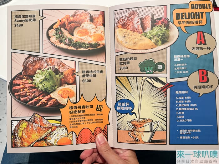 貳樓完美活力早餐有法國吐司、兩顆半熟蛋、沙拉、酪梨、薯餅、熱狗