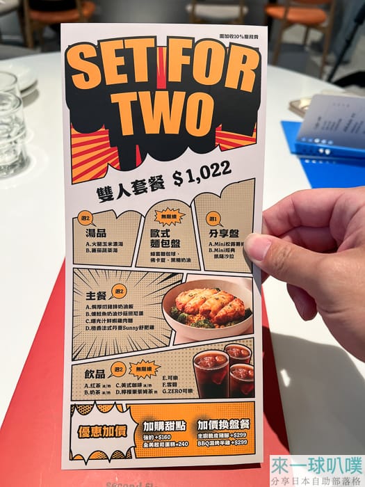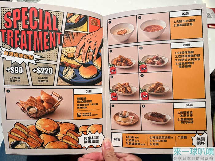 可以+90(5選1)或+220元(5選3)升級套餐,加購商品有麵包、湯品、甜點、炸物小點、飲品