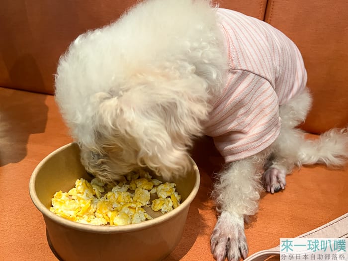 店家會詢問寵物名字,然後在招待的水跟炒蛋上寫歡迎寵物的名字,還蠻貼心的!