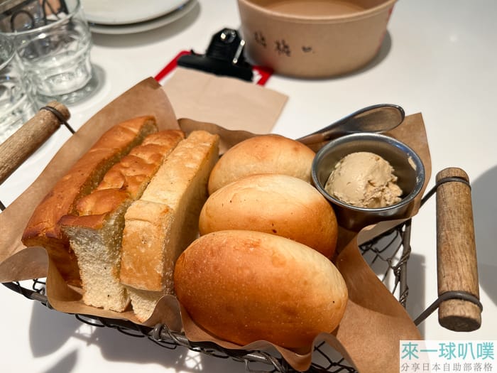 歐式麵包盤:蜂蜜麵包球、佛卡夏、黑糖奶油,麵包類可以免費續,麵包不錯,推薦可以續,店員也會詢問是否要幫忙續。
