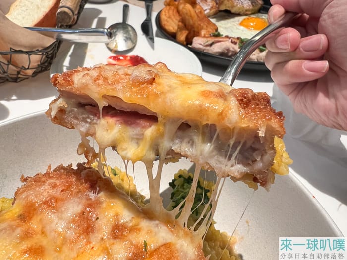 豬排蠻厚的份量很足,外皮酥脆,表面跟裡面都有起司,豬排裡面還有包火腿,但肉質比較普通