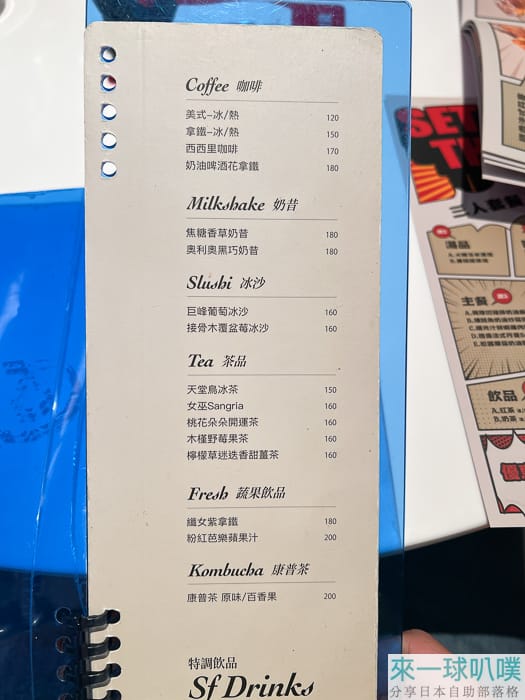新竹貳樓餐廳Second Floor Cafe菜單參考下方,餐點種類很多,有開胃菜沙拉、早午餐、義大利麵、燉飯、漢堡、肉盤累、甜點,飲料選擇就比較少一點咖啡、奶昔、茶