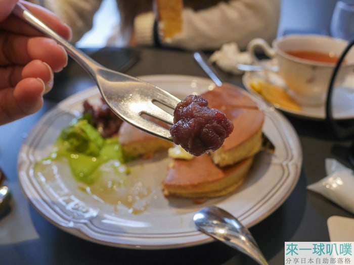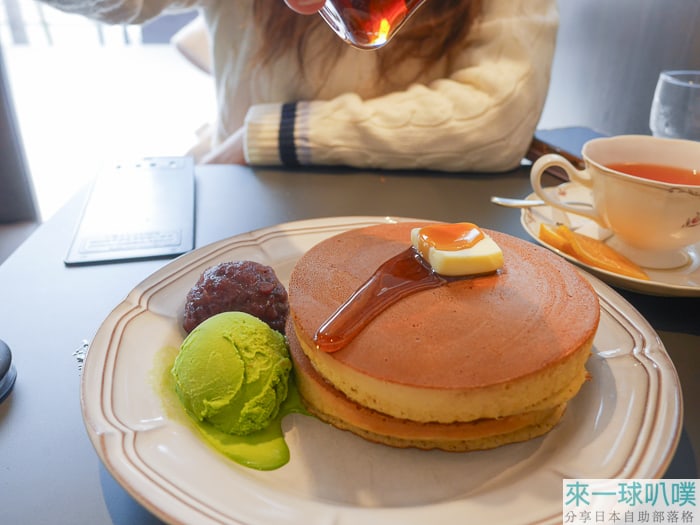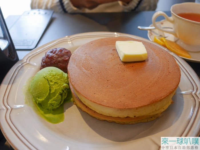 鬆餅份量算夠兩人分池,上方有一塊奶油,旁邊有紅豆泥跟抹茶冰淇淋,另外還有提供蜂蜜可以沾鬆餅吃