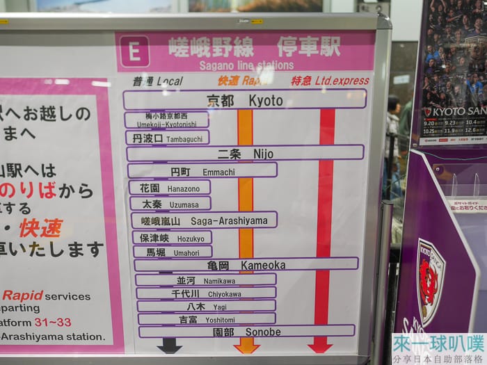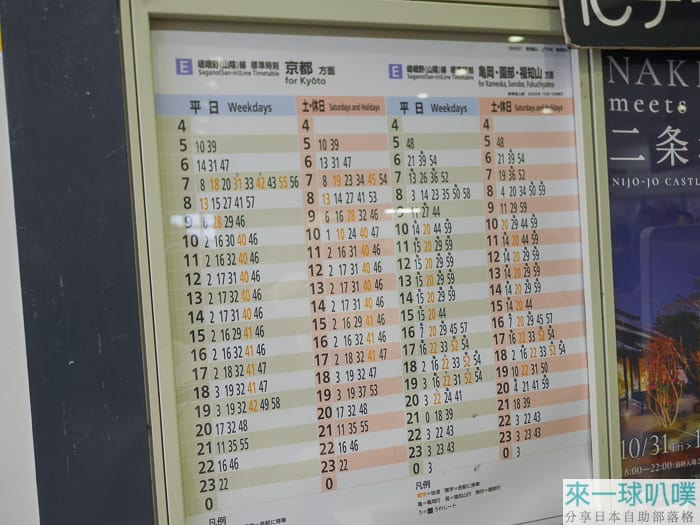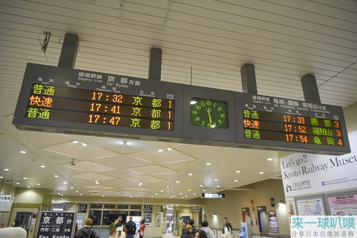 ▶如果是從京都站出發到嵐山,最推薦使用JR西日本鐵路山陰本線,車程17分鐘、票價240日幣,直接使用日本交通IC卡或手機版ICOCA/ SUICA搭乘就好,搭車月台在31~33月台,可以看時刻表確認,普通車或快速列車都可以搭乘。