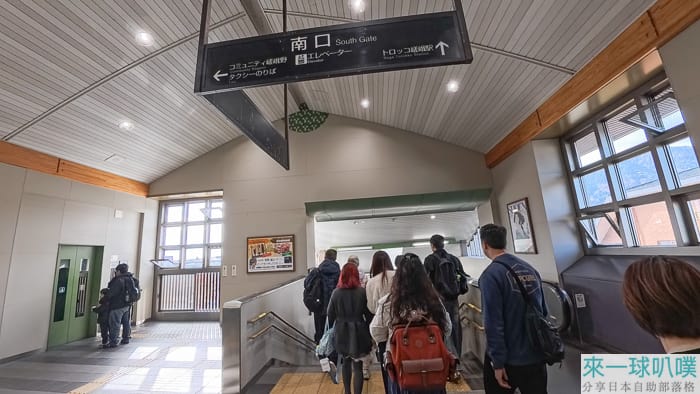- 南口是往嵐山大街、嵐山公園、嵐山竹林、天龍寺、渡月橋、嵐山小火車方向