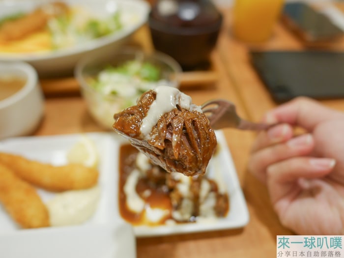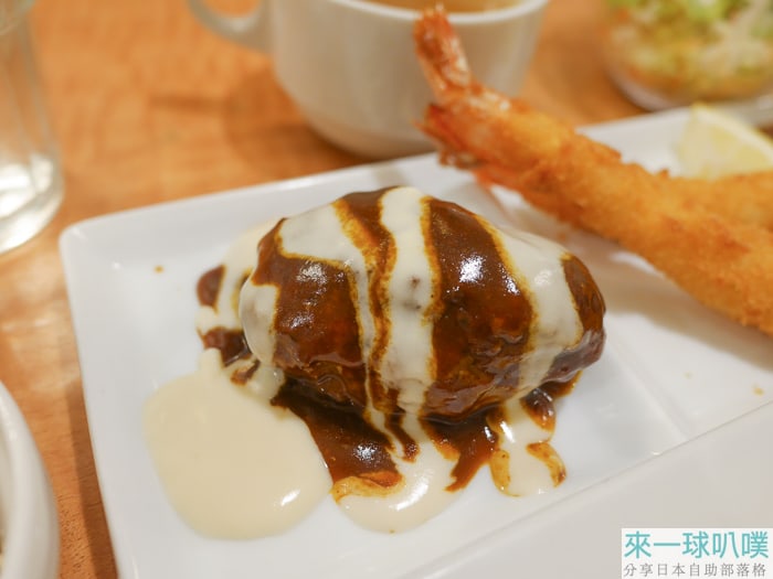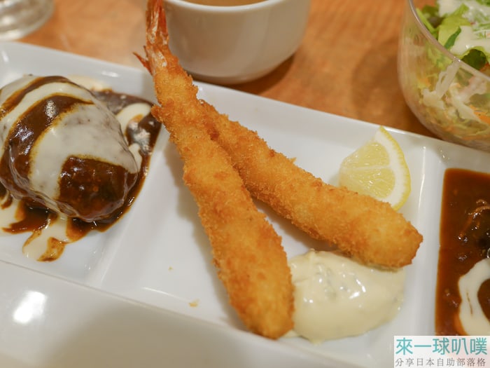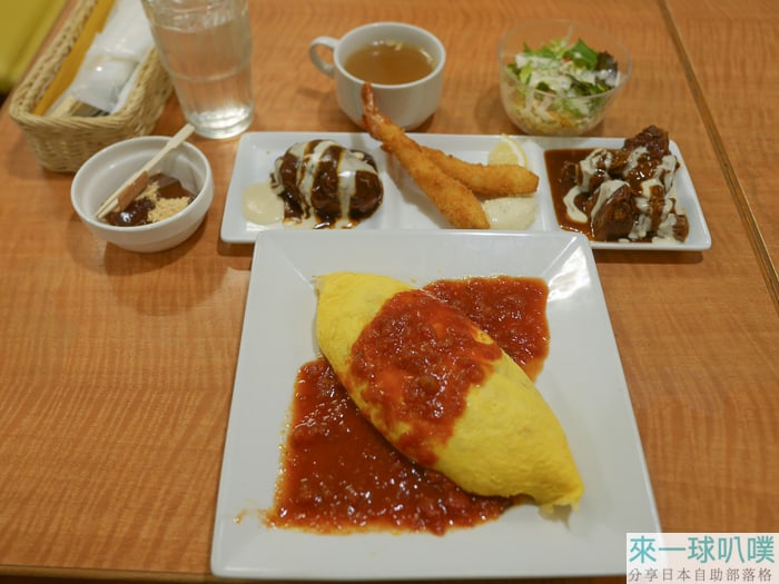 有一份蛋包飯,主餐我選燉牛肉+炸蝦+漢堡排,配菜有湯沙拉跟甜點。