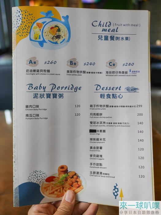 100公分以上孩童或大人需點一份主餐或飲品(約 $160-$200 起)。