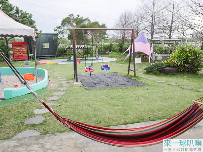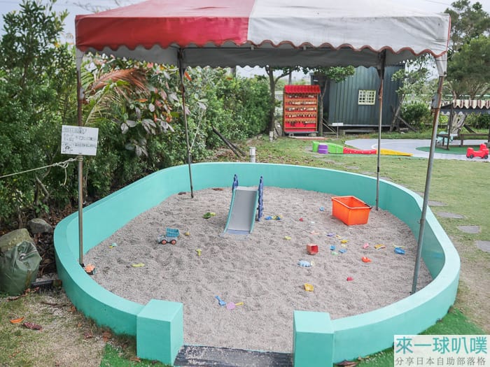 戶外區也有沙堆、盪鞦韆、小朋友的玩具車,沙堆旁也有簡易沖洗區,讓小朋友玩完可以清洗一下,不過如果夏天時天氣應該會很熱,要幫小孩做好防曬與補充水分