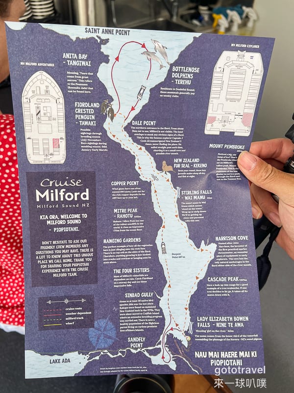 下方是米爾福德峽灣觀光船的路線參考,基本上各家業者都差不多,會從米爾福德峽灣附近碼頭出發,虛線是一定會走的路線,紅色就視天況而定,沿途有機會(運氣)看到企鵝、海豚、海豹,整趟行程大概要兩小時左右。