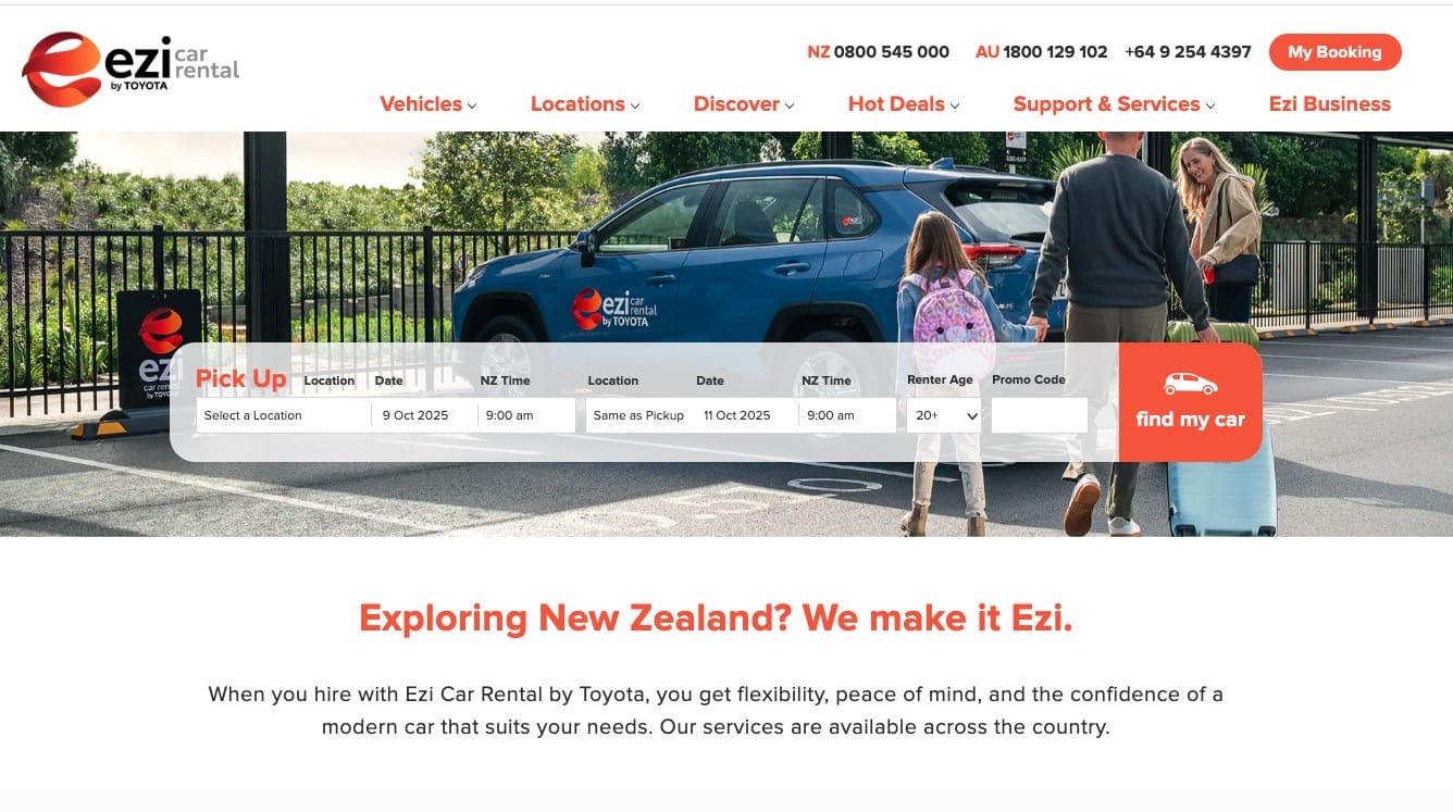 ▶紐西蘭幅員廣大,大眾交通運輸較不方便,很適合開車自駕,這次到紐西蘭南北島自助都是開車自駕,南島部分我們是在基督城租車,選擇這間Ezi Car Rental,Ezi Car Rental成立於1998年,2023年被豐田收購,在紐西蘭南北島有20幾個營業據點,像奧克蘭機場、基督城機場、皇后鎮機場、威靈頓機場..等比較熱門機場都可以直接領車,超方便。