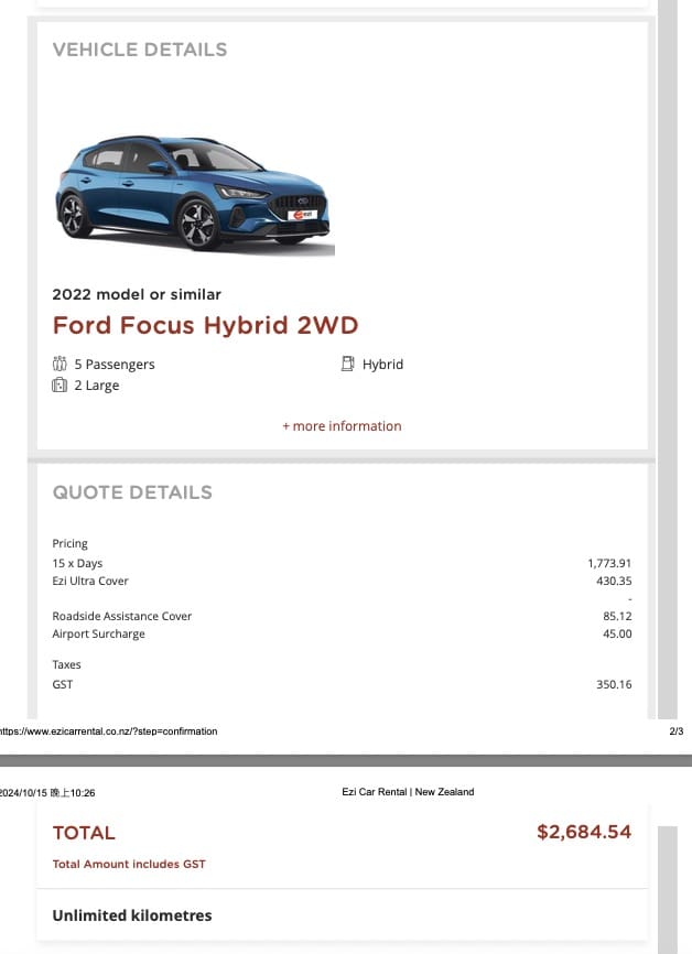 下方是這次最後租車15天,租車費用+保險+道路救援的總費用,機場取件會再收一筆處理費用45紐幣,這樣總額NZD$2,684.54