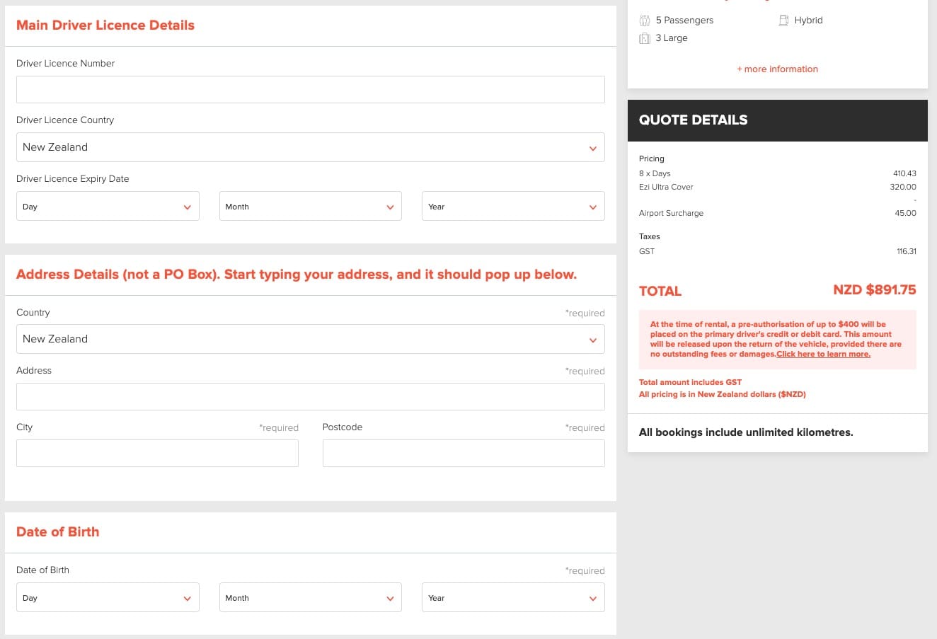 均需至少預授權 NZD$400 作為保證金。