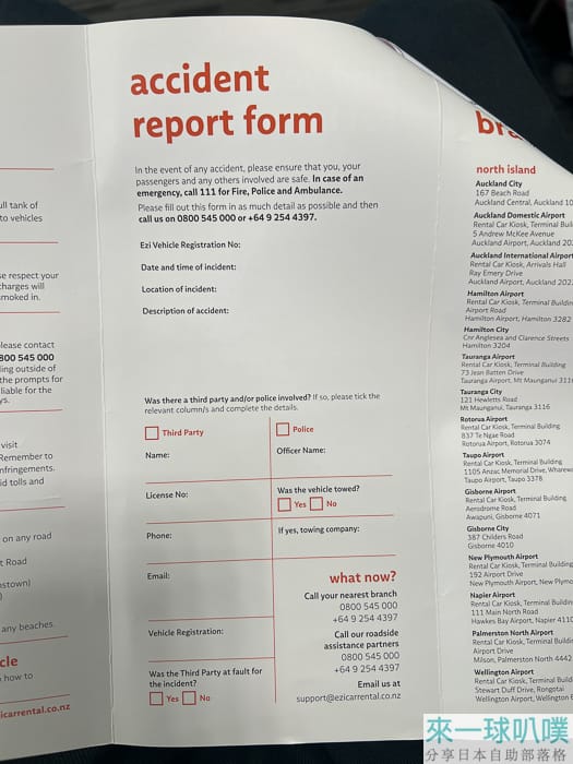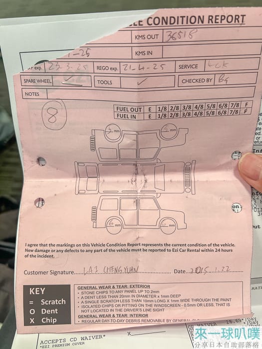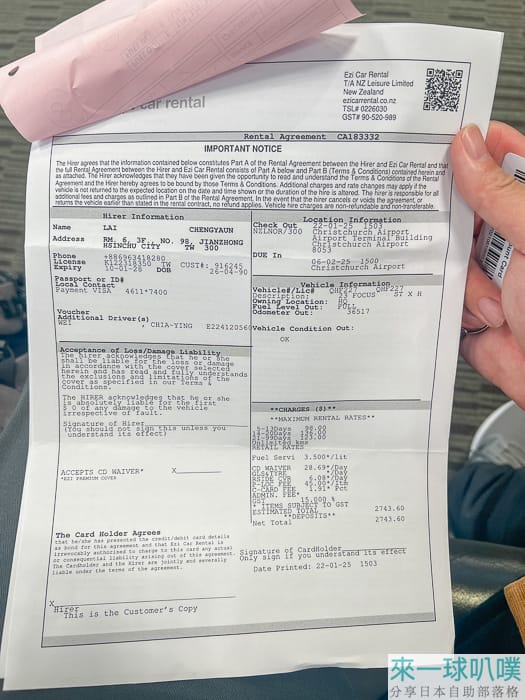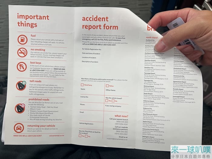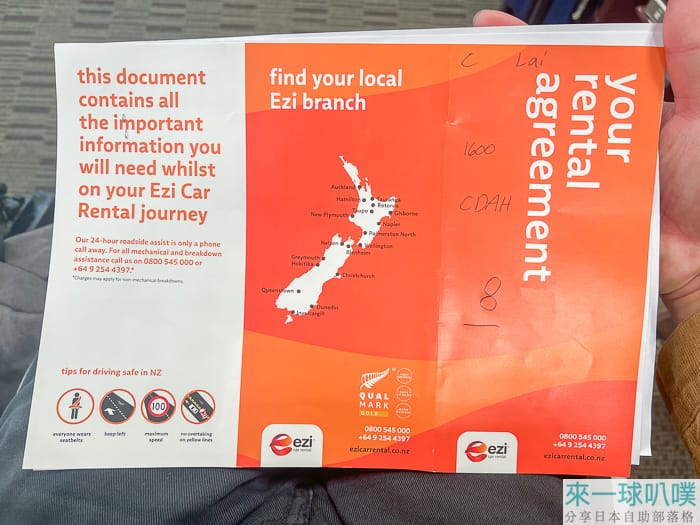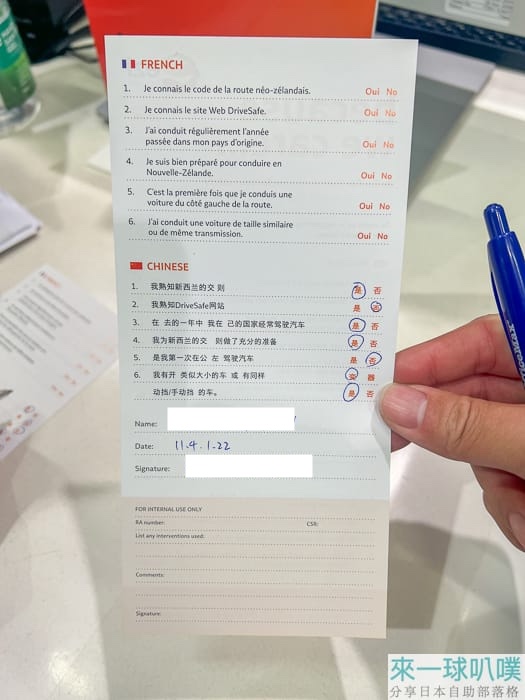 請你簽名一份勾選項目,開車的人都要簽,大概是一些紐西蘭基本交通,有些項目規定一定要勾是,可以再跟櫃檯人員確認。
