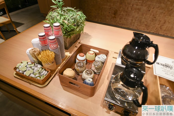 公共區有提供免費茶飲,也有四種伊藤久右衛門的茶葉可以泡