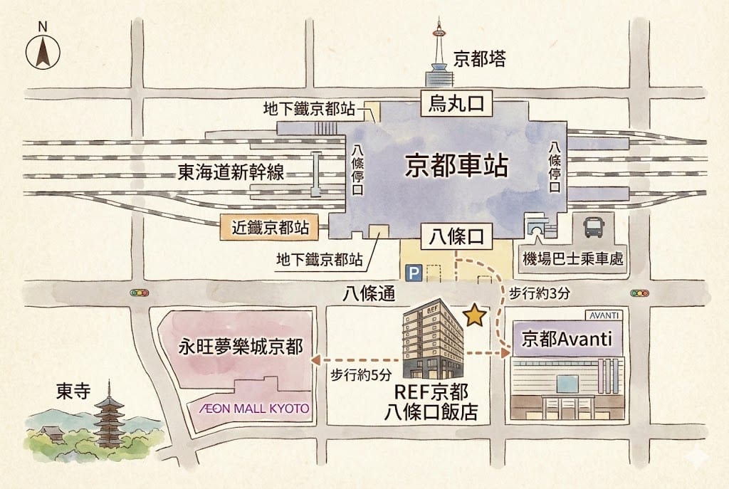 REF京都八條口飯店位置在京都車站八條口,這邊相較烏丸口會更安靜一點,想逛街可以前往AEON MALL KYOTO、京都AVANTI購物中心、京都porta地下街