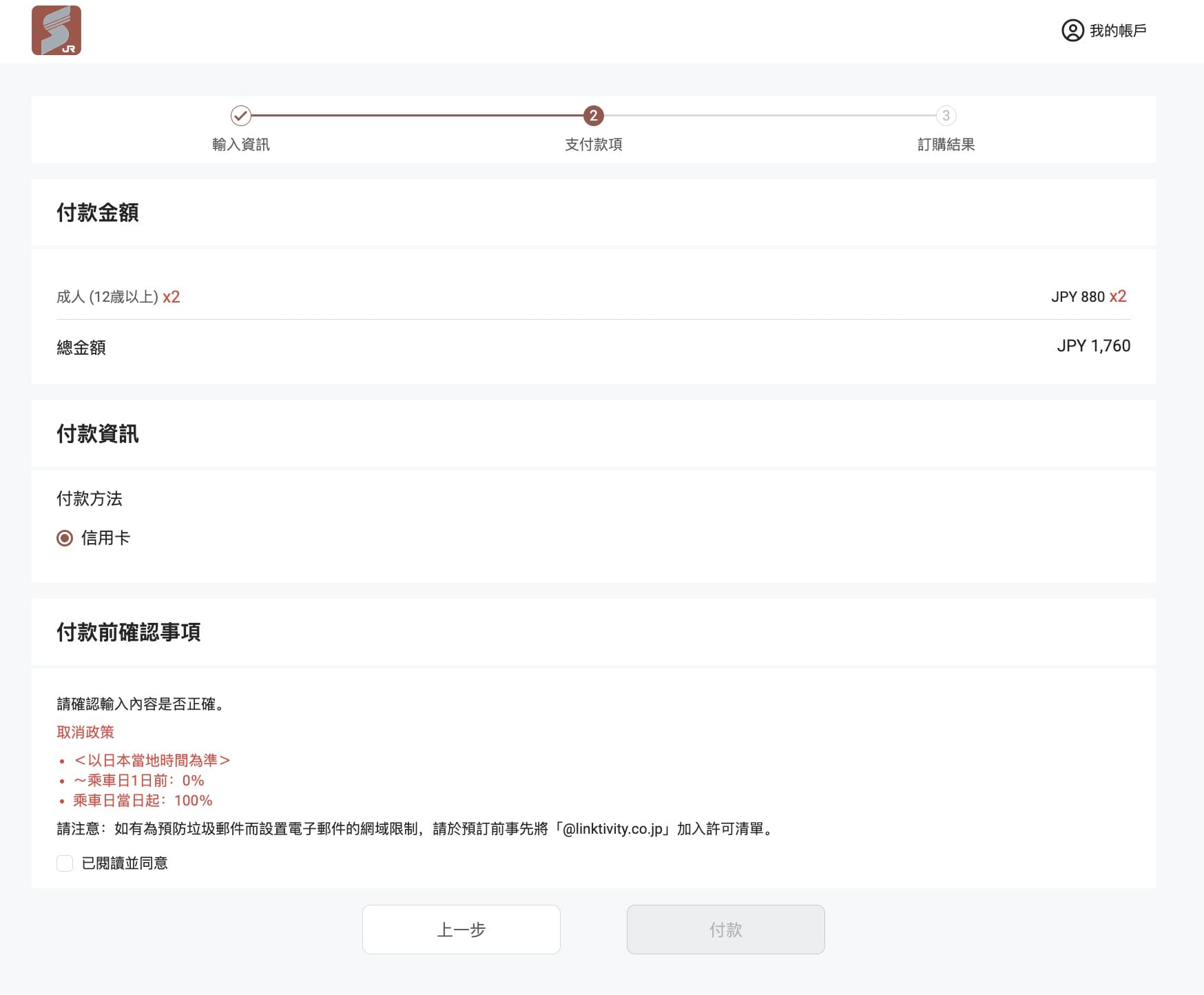 - 取消政策:~乘車日1日前:免費取消、乘車日當日起:不退費