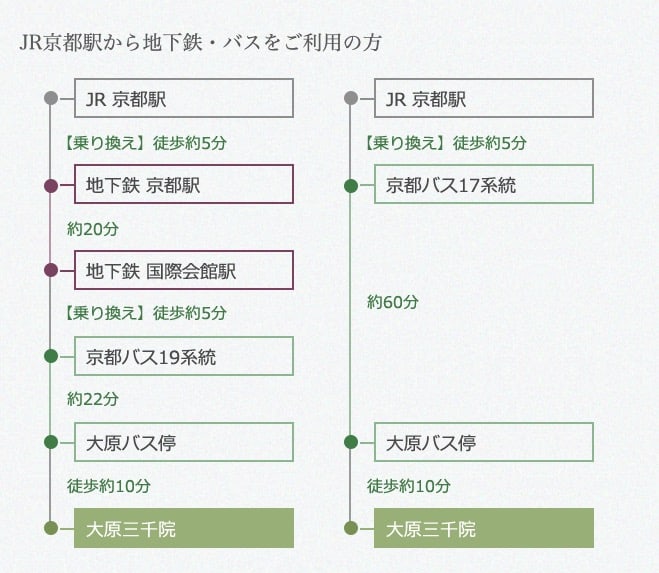 適合入住在京都地下鐵沿線上的朋友使用,可以先搭京都地下鐵烏丸線到「國際會館駅」下車,出站轉乘京都巴士到大原巴士站