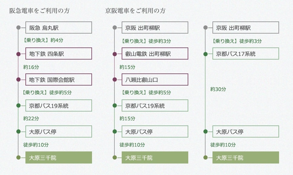 京都市地下鐵烏丸線(南北方向)到「國際會館駅」下車,(轉乘)京都巴士19 號 /特16號/特17號到終點站「大原」