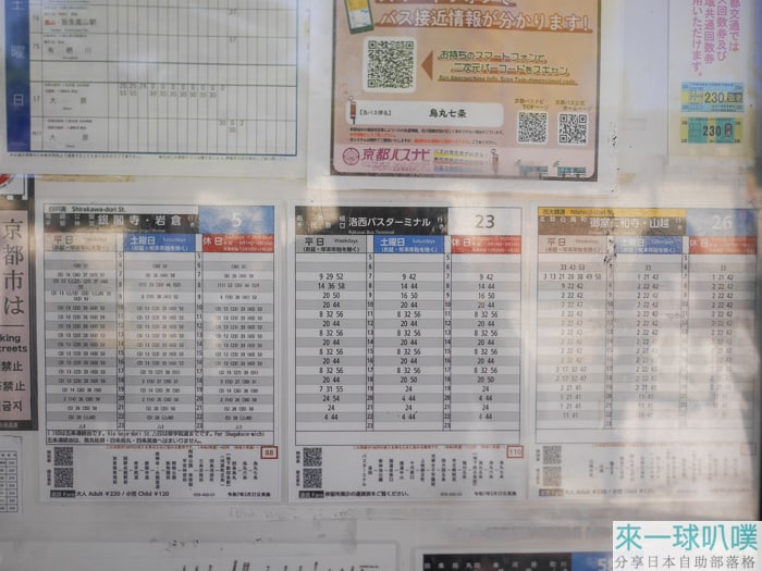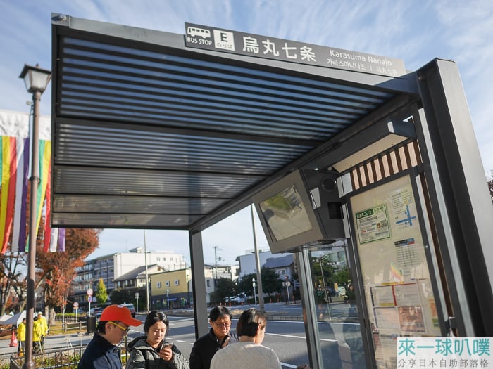 我們這次是從入住TUNE STAY KYOTO飯店出發到三千院,最靠近的車站是烏丸七條站,站牌這邊都會告知時刻表,可以現場查詢班次,或參考京都巴士官網