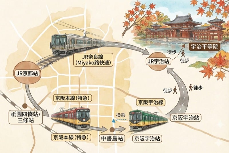 出發到京都三千院的交通方式有三種,比較建議採用(1)(2),可以搭配乘換案內選擇合適交通方式