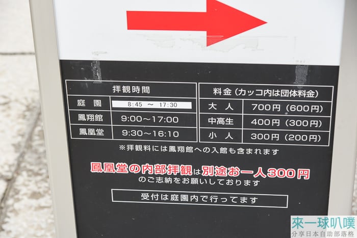 上方門票不包含鳳凰堂參觀,如果要參觀,需要一人多付300日幣,入園後先去預約場次。