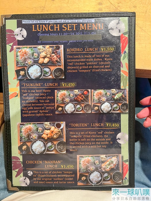 KOKORO 午餐套餐¥1,550 這是本店推薦的午餐,包含兩種主菜:正宗炭火烤製的京赤地雞肉串和炸雞天婦羅。