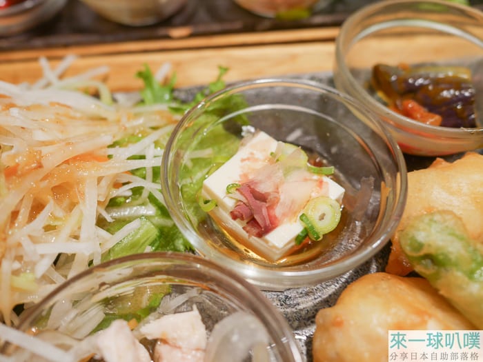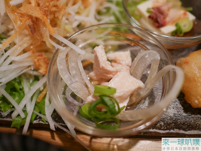 主要有炸雞胸天婦羅、烤雞肉丸、烤雞心、烤雞胸、沙拉、白飯、湯、涼拌雞胸、茄子、涼拌豆腐,右下角的沾醬是味噌